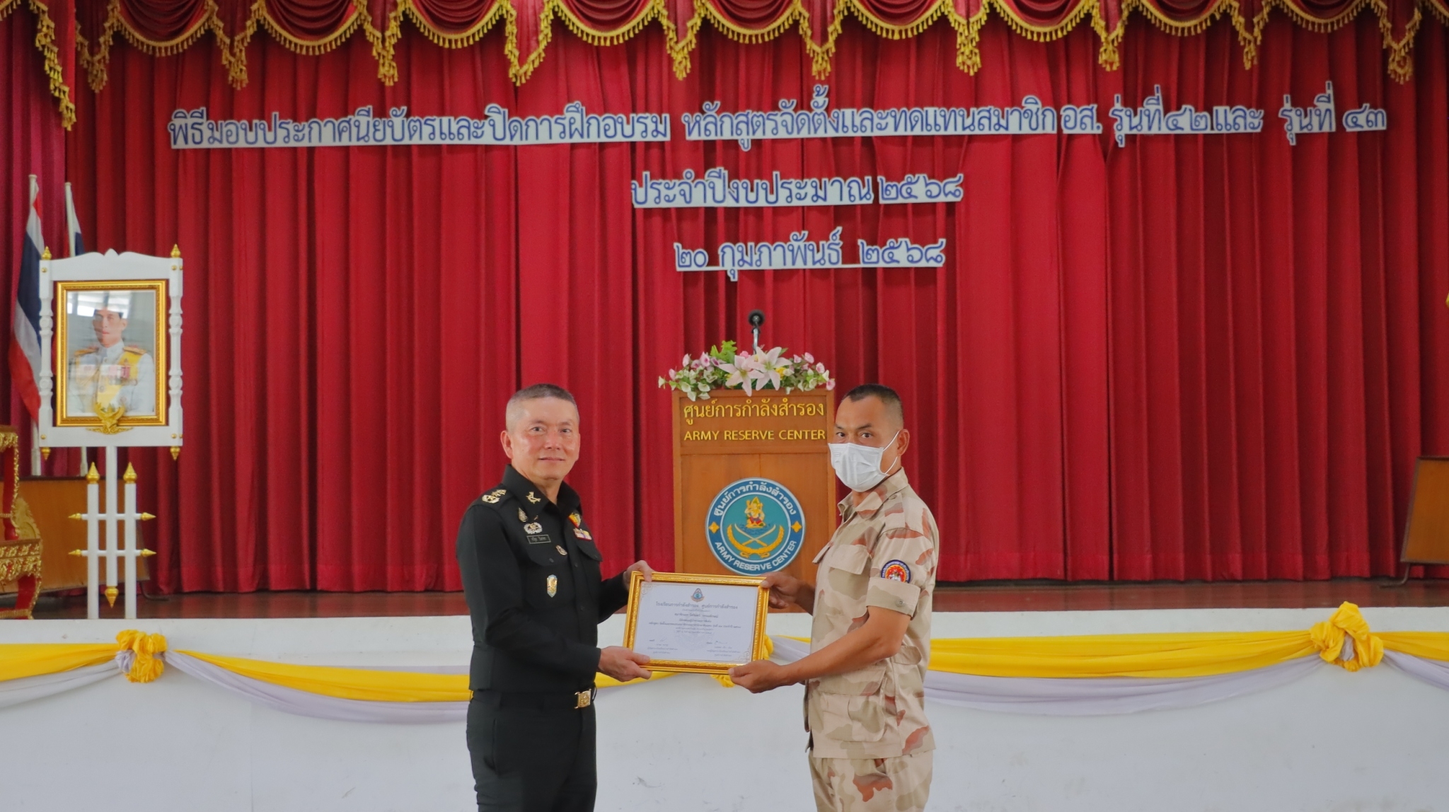เมื่อวันพฤหัสบดีที่ 20 กุมภาพันธ์ 2568 เวลา 10.00 น. พล.ท.ทวีพูล ริมสาคร ผบ.นรด. เป็นประธานพิธีมอบใบประกาศนียบัตรและปิดการฝึกอบรม หลักสูตรจัดตั้งและทดแทนสมาชิก อส. รุ่นที่ 42 และ รุ่นที่ 43 ประจำปี 2568 ณ หอประชุม ศสร. โดยมี พล.ต.เกษม ตราชู ผบ.ศสร. พร้อมด้วยคณะผู้บังคับบัญชาของหน่วยร่วมให้การต้อนรับและเข้าร่วมพิธีอย่างพร้อมเพรียง
