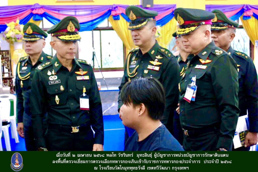 เมื่อวันพุธที่ 2 เมษายน 2568 พลโท วัชรินทร์ มุทะสินธุ์ ผู้บัญชาการรักษาดินแดน ตรวจเยี่ยมการตรวจเลือกฯ ประจำปี 2568 ณ โรงเรียนวัดโกมุทพุทธรังสี เขตทวีวัฒนา กรุงเทพฯ